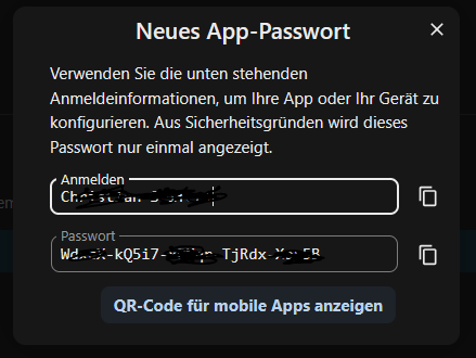 In der Adresszeile tippen Sie die Adresse ein. Haben Sie das App-Passwort auf einen anderen Gerät erstellt können Sie über das QR-Code Symbol darunter einloggen. Dazu wählen Sie auf dem anderen Gerät „QR-Code für mobile Apps anzeigen“ und scannen dann via der App den Code.