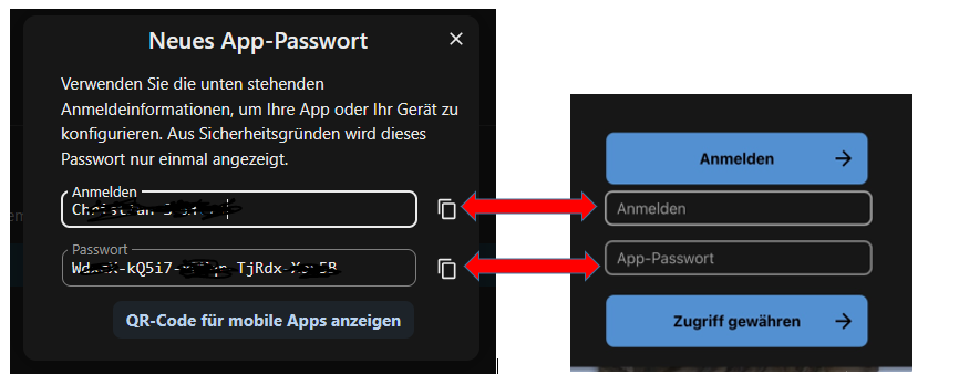 Auf der nächsten Seite fügen Sie die Daten von der Webseite erzeugten Code ein. Sie können diesen mit dem Kopiersymbol automatisch in die Zwischenablage kopieren und in der App wieder einfügen. Sind beiden Werte eingefügt klicken Sie auf „Zugriff gewähren„. Jetzt ist die App mit der Nextcloud wieder verbunden.