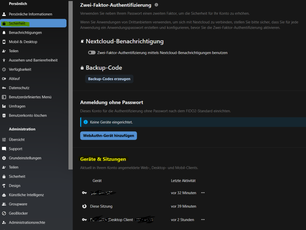 Wiederholden Sie die Schritte wie zuvor bis zum Punkt Sicherheit und dieses mal scrollen wir im Fenster Passwort nach unten. Dort finden unter dem Punkt: Geräte & Sitzungen Sie alle derzeitigen Verbindungen mit Ihrem Account zur Cloud EAC.