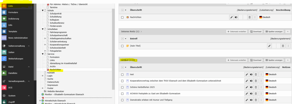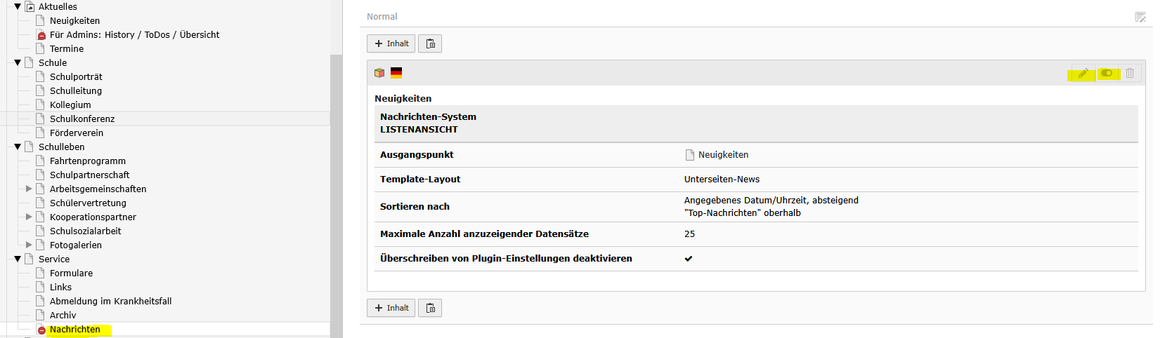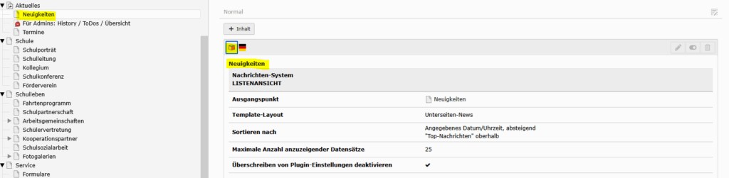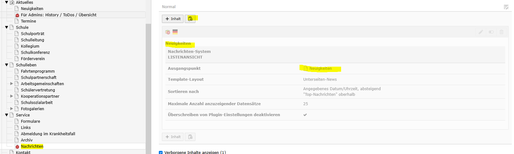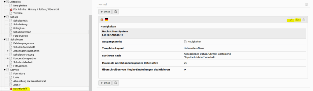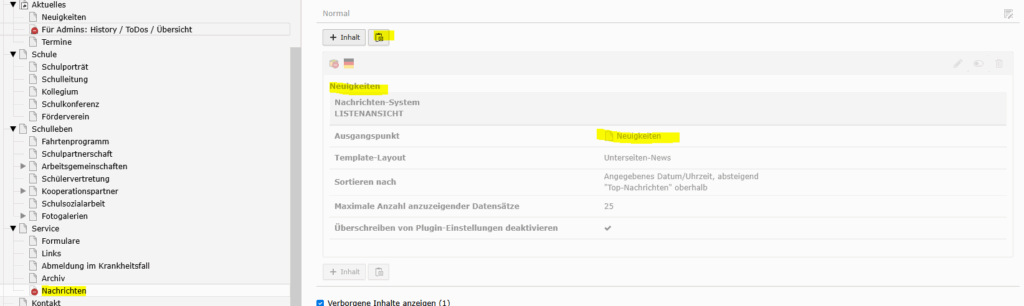 3. Die neue Seite aufrufen – hier „Nachrichten“ und Objekt einfügen und aktivieren (sichtbar)